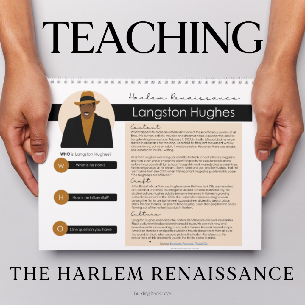 The major themes of the Harlem Renaissance are the celebration of Black culture and the power of artistic expression. A fun way to introduce these themes and other topics is with a Harlem Renaissance BINGO board. As you can see, students can use the board to see how well they relate to topics, try to guess how they might all be connected, and get a visual general overview of this vibrant cultural movement. Would you like a copy of this Harlem Renaissance BINGO board? You can grab FREE resources by signing up for my Building Book Love Letter here: